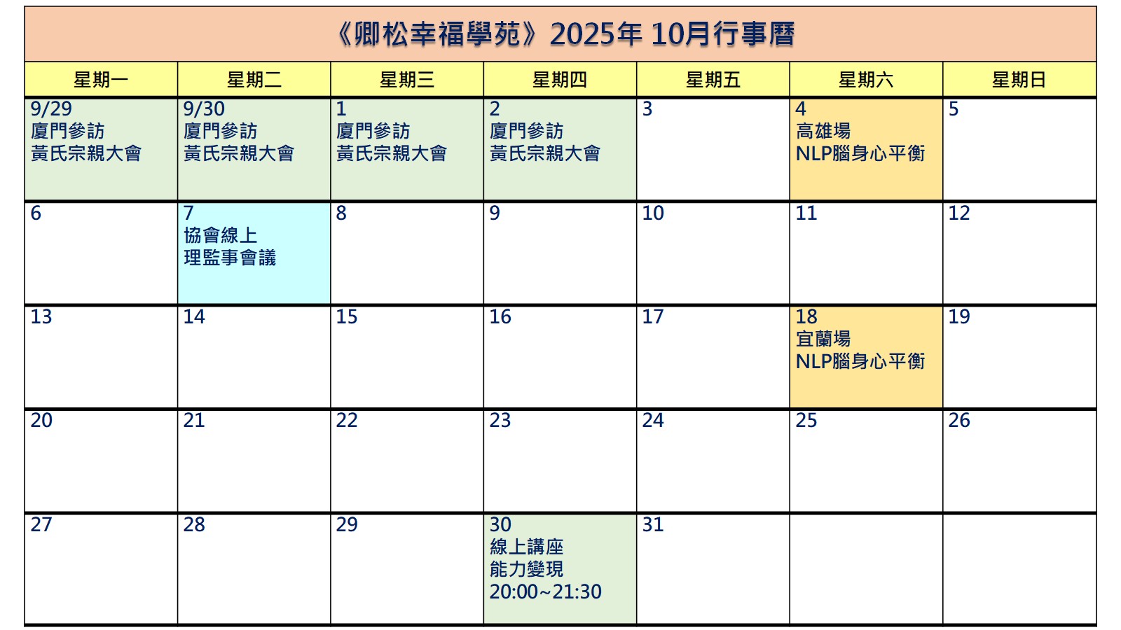【每月行事曆】2025年10月行事曆(10/20更新)