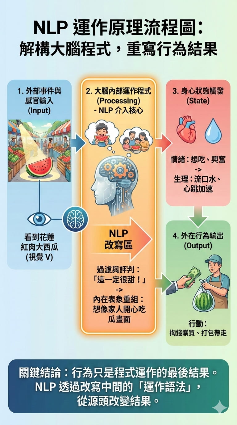 換句話說,NLP的關鍵是大腦的運作原則,基於這個原則,技巧就變得有所效用。