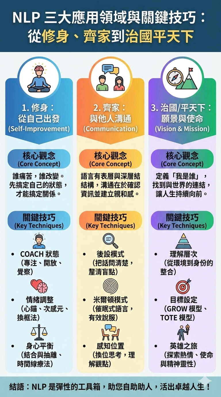 基於這樣的原理,NLP發展出應對不同運作階段的技巧,舉凡感官經驗、過往的人生經驗、信念、價值觀、內在的視覺想像、聽覺想像、嗅味觸想像、身體的狀態感受、心情情緒等等都能夠透過NLP的「語法」來改寫,就好比電腦程式能夠在出錯時做修正更新,來恢復或更進階的發揮原有的功能。